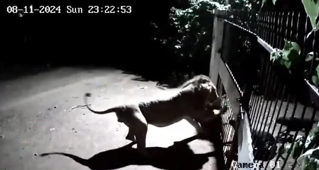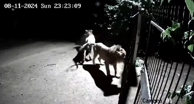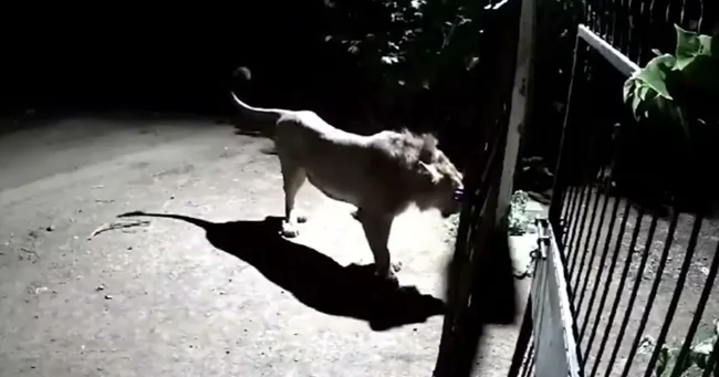 До мережі потрапили лякаючі записи з камер відеоспостереження із села Тораді, Гуджарат, Індія. Пізнього вечора леви підбігли до воріт, але пробратися в корівник їм завадили двох сторожових собак.