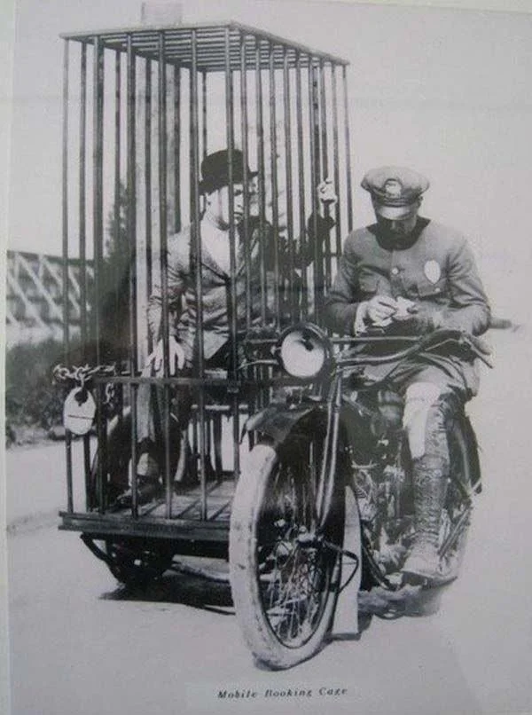 9. Поліцейський на мотоциклі Harley-Davidson перевозить ув'язненого в клітці, 1921 рік