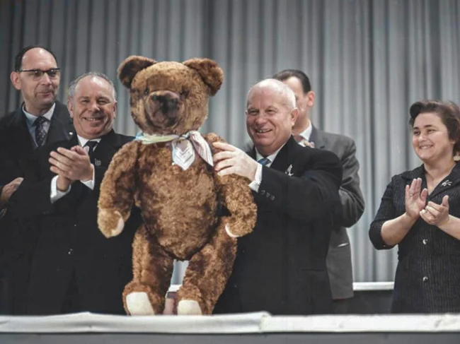 Микита Сергійович Хрущов із плюшевим ведмедем, подарованим працівниками заводу телевізійної електроніки. НДР, Берлін, 18 січня 1963 року.