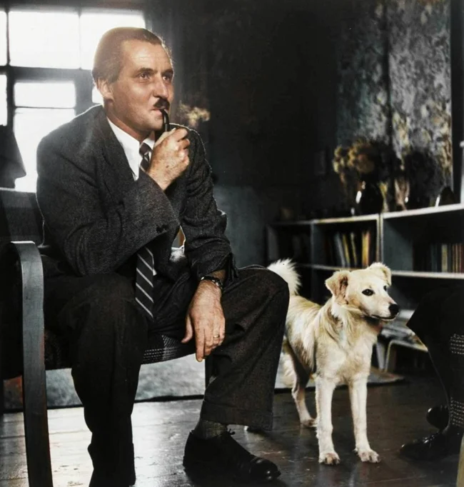 Радянський поет, драматург і військовий кореспондент палить трубку в компанії волохатого друга.