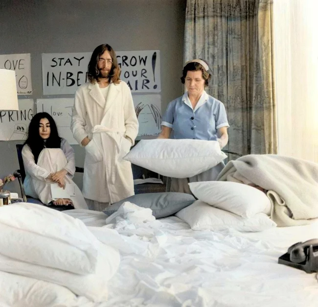 Джон Леннон і Йоко Оно чекають, поки покоївка змінить ліжко, щоб вони могли продовжити протест проти війни у В'єтнамі, 1969 рік.