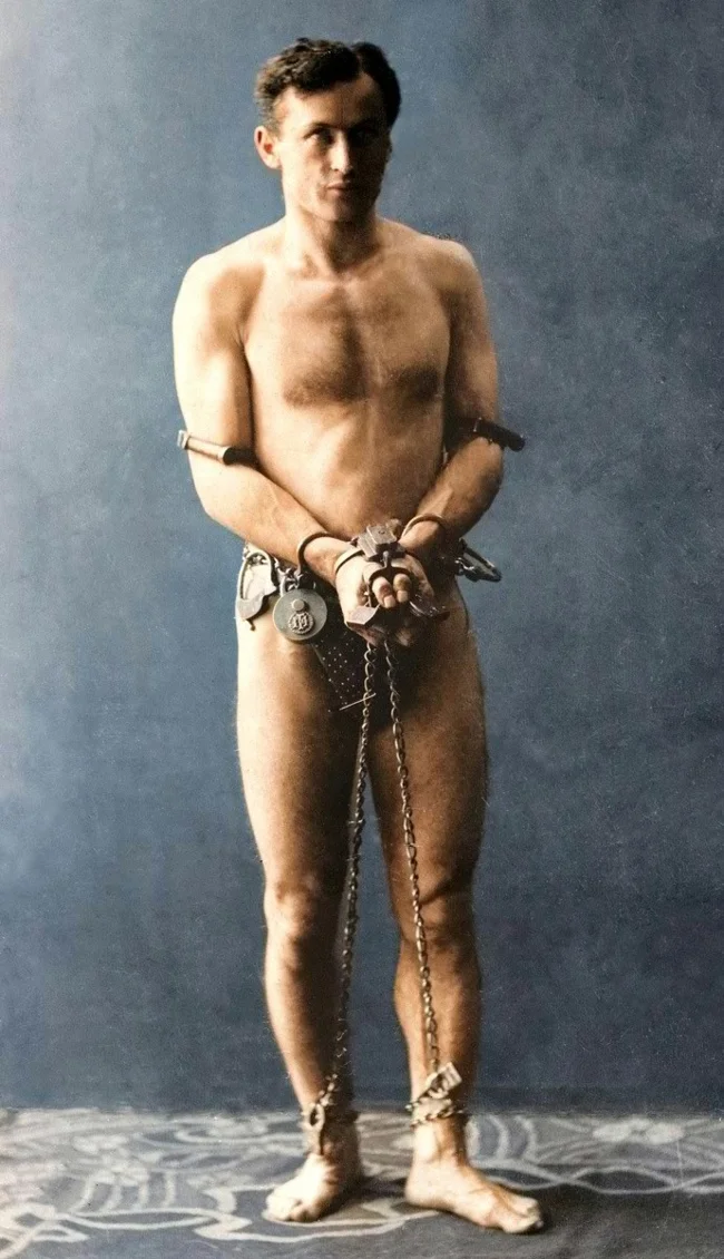 Легендарний Гаррі Гудіні, портрет на повний зріст, що стоїть у ланцюгах. Ок. 1900 року. Американський ілюзіоніст, філантроп та актор. Прославився викриттям шарлатанів та складними трюками з втечами та звільненнями. Замки, захоплення, браслети спеціальної конструкції. На цьому багато в чому і засновані його номери, та й тренована рухливість суглобів звичайно.