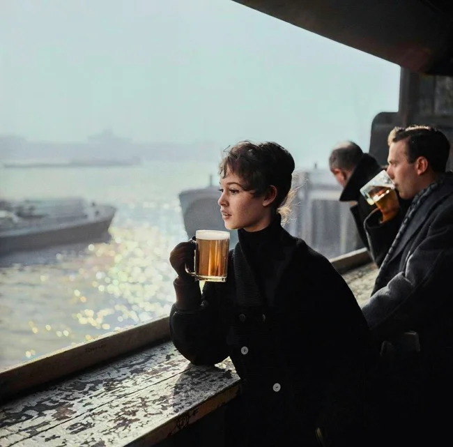 Ще зовсім молода французька актриса фотографується з пінним напоєм у барі і дивиться на пристань. На знімку їй лише 19 років. Її дебют у кіно припав на 1952 рік у фільмі «Нормандська діра», а за спиною в актриси понад 80 кінокартин.