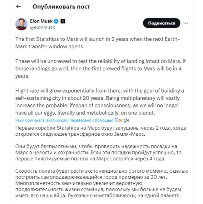 Перші Starship вирушать на Марс через два роки, коли відкриється наступне трансферне вікно між Землею і Марсом. Вони будуть непілотовані, щоб перевірити безпеку посадки на Марсі. Якщо посадка пройде вдало, перші пілотовані польоти на Марс плануються за чотири роки», — написав Маск у соцмережі X.