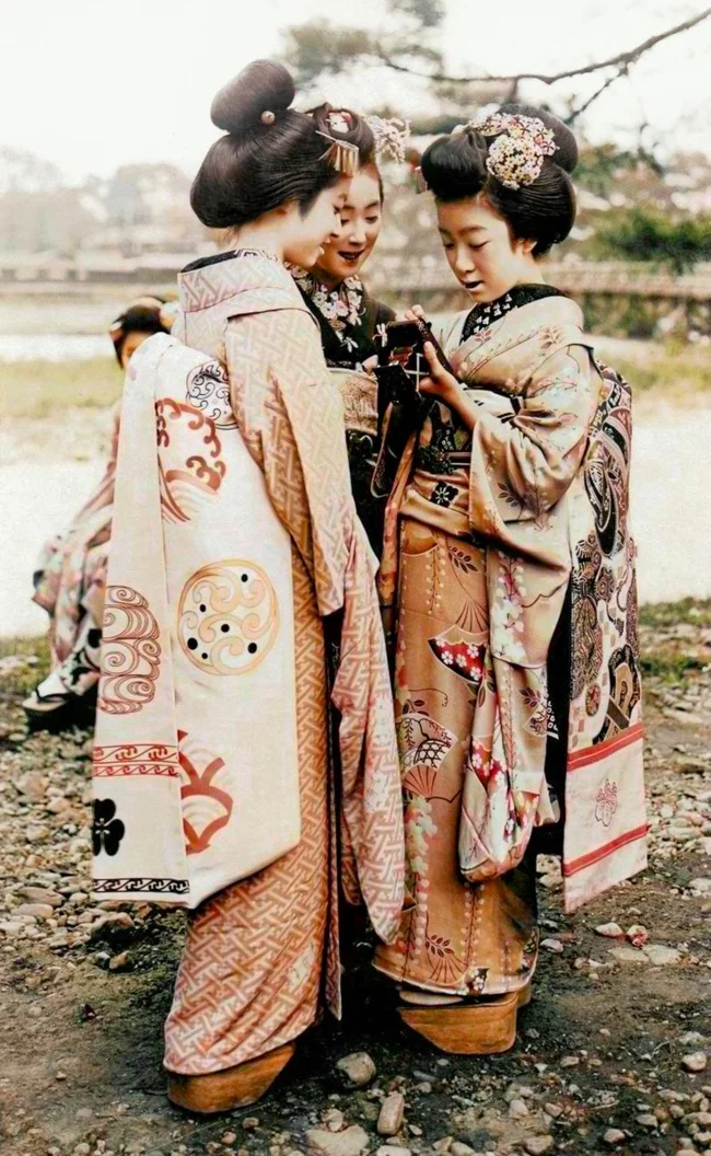 Три японські майки розглядають фотокамеру. 1920-ті роки.