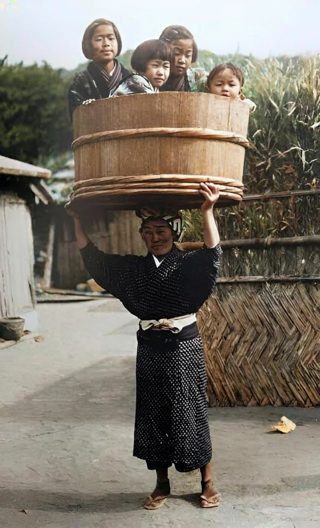 Японська жінка несе своїх дітей у відрі на голові, Японія, 1900-х років.