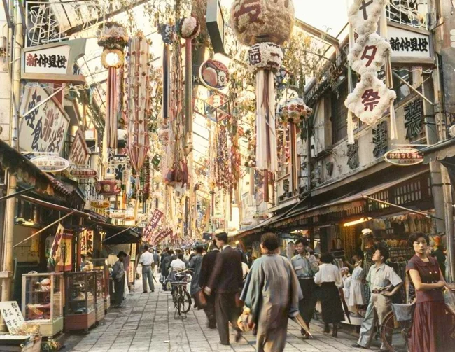 Оздоблена вулиця в Токіо, Японія, під час свята Танабата, 1954 рік.