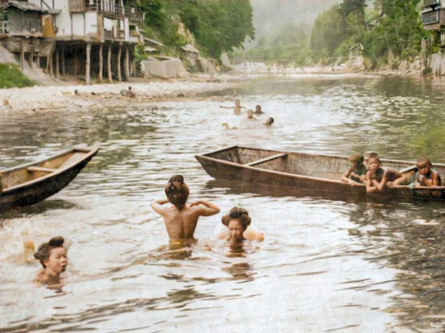 Люди купаються в річці у літню спеку. Японія, 1915 рік.