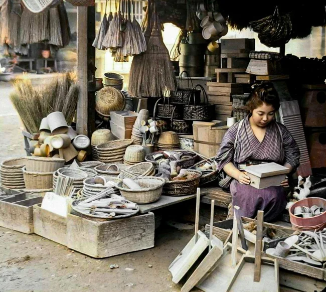 Дівчина продає дерев'яне домашнє начиння. Японія, 1898 рік.