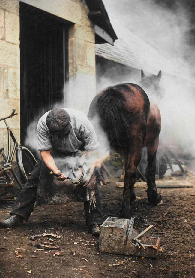 Копито розчищене, йде гаряче припасування нової підкови. І досі деякі ковалі роблять так само. До речі кінь, схоже, ломовий, на підкові гарні ґрунтозачепи видно. А знімок вийшов дуже ефектним.