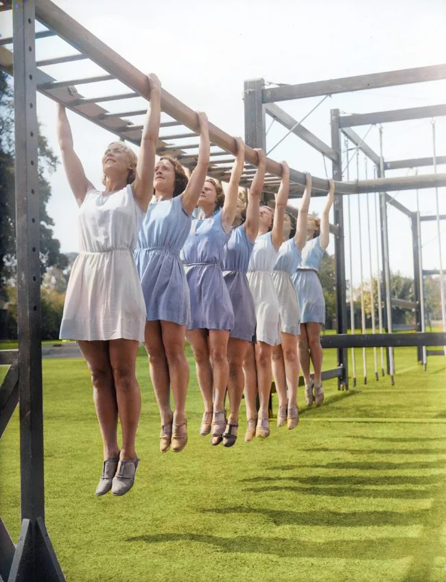 Іноземні учні на уроці фізкультури на відкритому повітрі в англо-скандинавській літній школі в Мілнер-Корті, Старрі, Кент, 1935 рік.