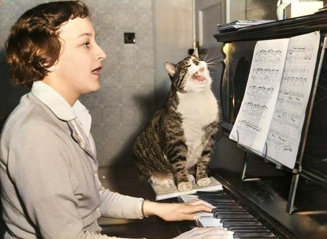 Кіт, який обожнює музику, підспівує господині у Вустері, Англія, 1959 рік.