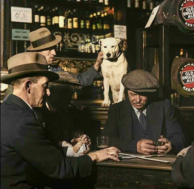 Собака цікава. Швидше за все це Буль енд тер'єр (не бультер'єр). На почесному місці на барній стійці билася в собачих боях або заганяла биків. Ці лондонці навряд чи вирізнялися сентиментальністю. Значить, собака приносила гроші.