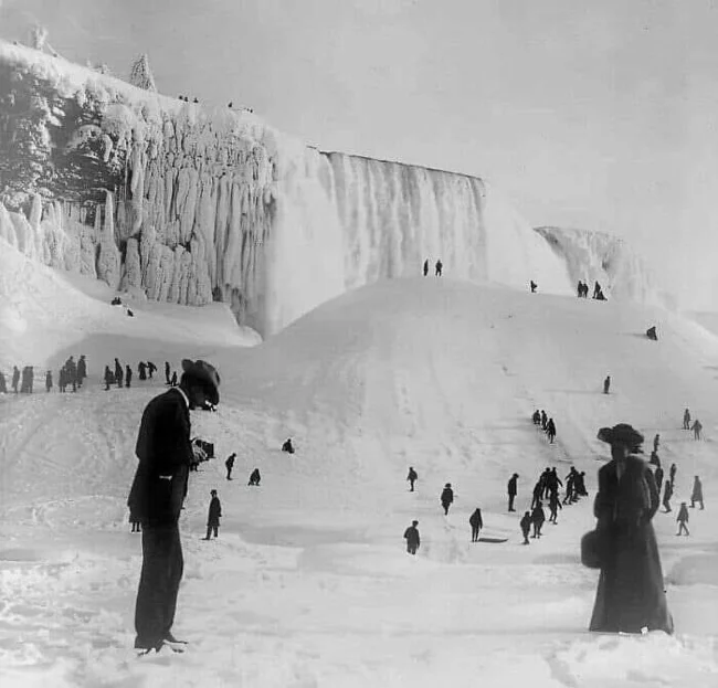 10. Люди катаються на замерзлому Ніагарському водоспаді в зимові місяці, 1911 рік
