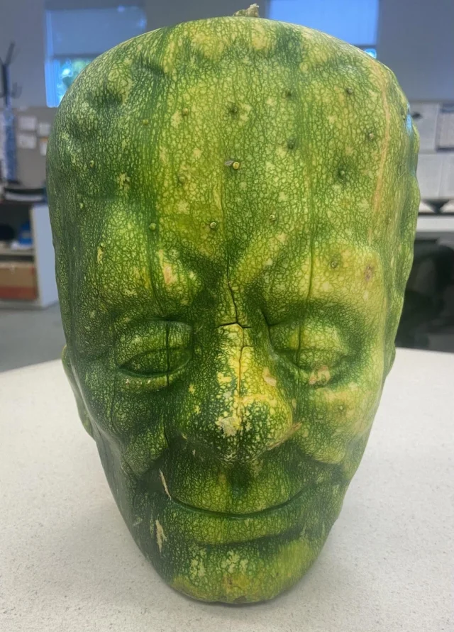 Звичайний гарбуз, що виріс у спеціальній формі. Тепер це голова у формі монстра Франкенштейна