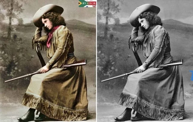 7. Енні Оуклі (американська жінка-стрілець) позує зі своєю гвинтівкою для журналу True West, 1890-і роки