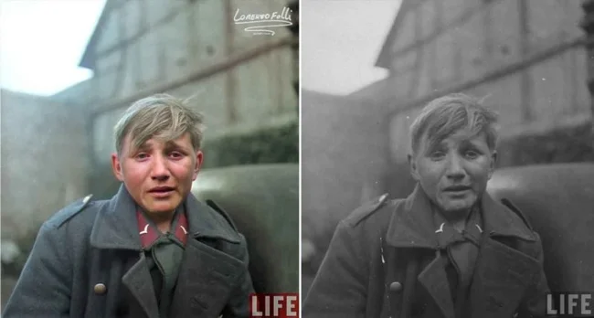 4. 15-річний член екіпажу німецької зенітної артилерії люфтваффе плаче після того, як був узятий у полон американськими військами у 1945 році