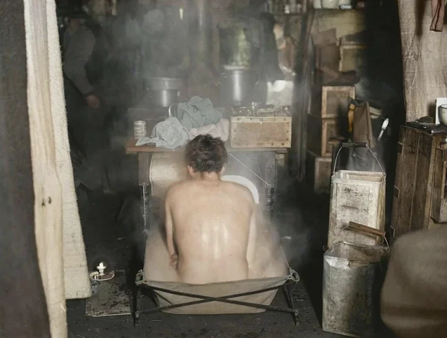 2. Чоловік приймає гарячу ванну під час Британської антарктичної експедиції.
