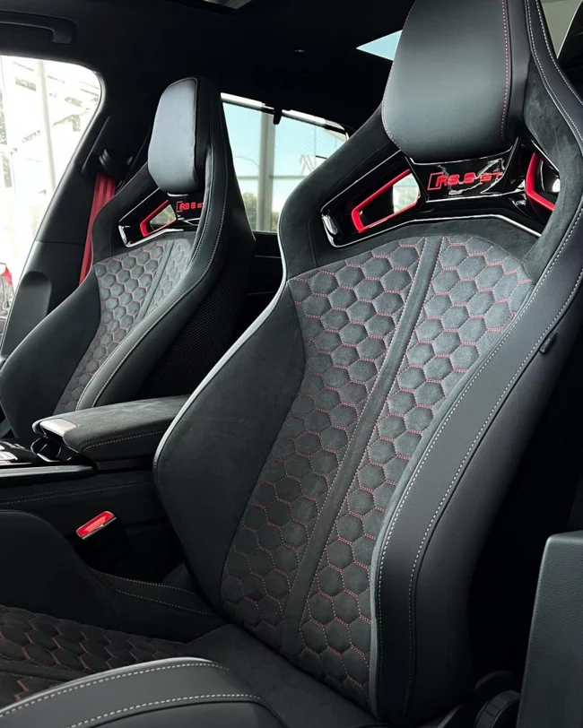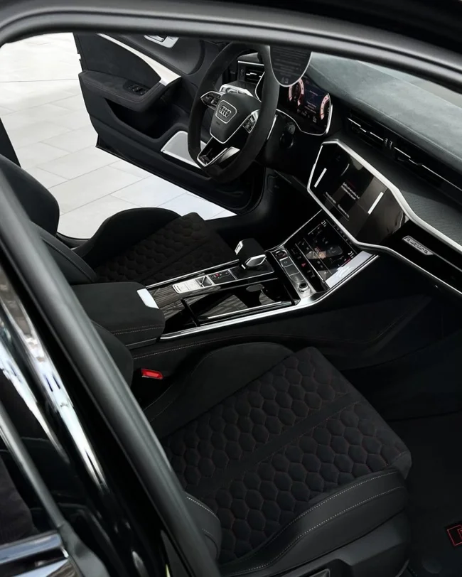 Салон Audi RS6 Avant GT оздоблений карбоном і алькантарою. Універсал отримав спортивні передні сидіння, а його комплектація включає матричну оптику, проєкцію на лобове скло, панорамний дах і потужну акустику Bang&Olufsen.