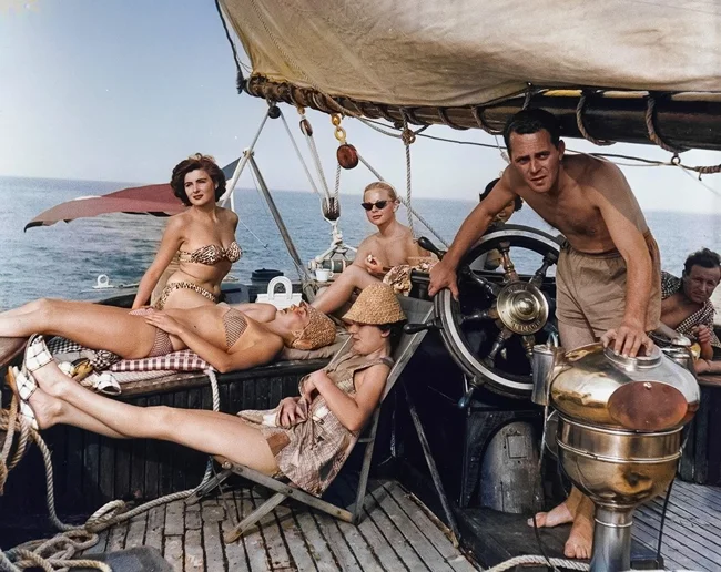 П'ять британських моделей відпочивають на яхті біля Блакитного берега, 1955 рік.