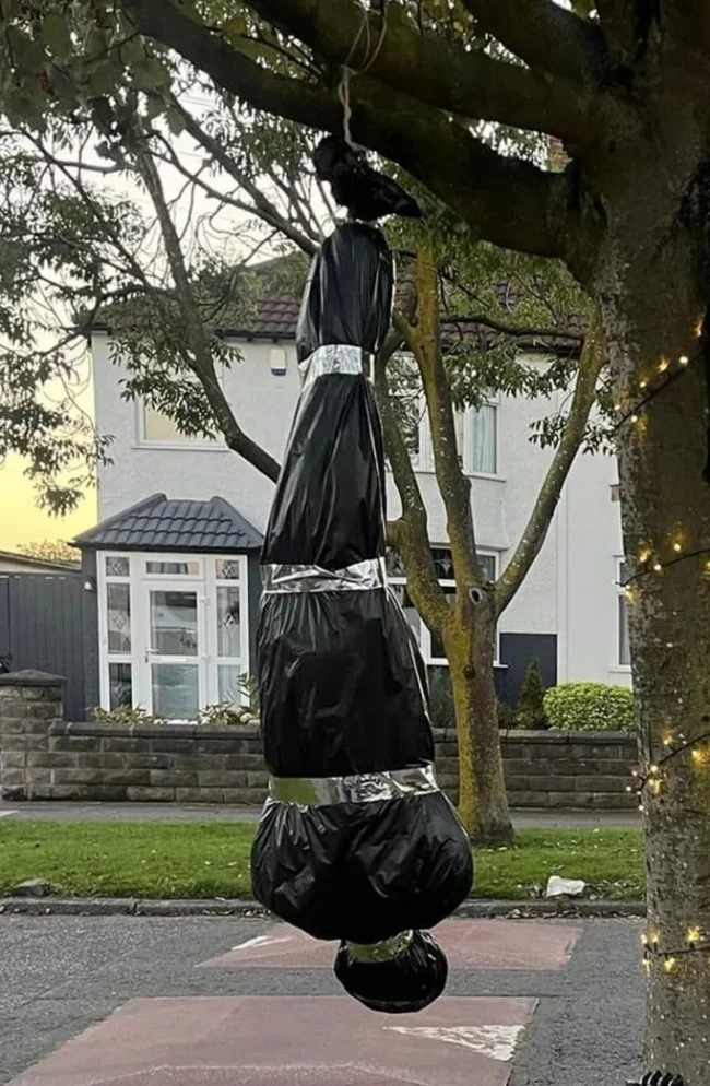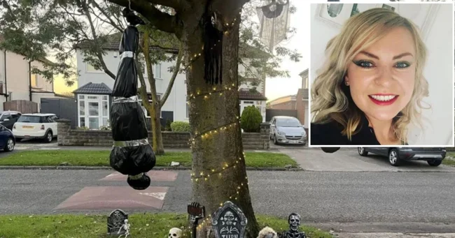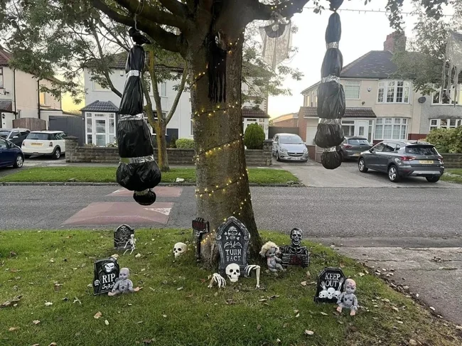 Мешканка Ліверпуля Керолайн Ешлі ґрунтовно підготувалася до найпохмурішого свята: прикрасила ганок гарбузами, розмістила на галявині пластикові надгробки, а на дерево повісила реквізит у натуральну величину. Ось тільки сусідка замість декору побачила трупи у пакетах і поскаржилася владі.