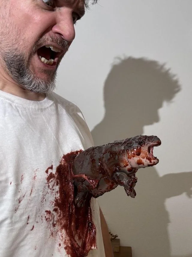 Пам'ятаєте карликового бегемотика із Таїланду Му Денга? За цей час він встиг стати справжньою світовою зіркою у соцмережах. Народ не перестає розчулюватися цьому пухкому симпатязі. А цей хлопець вигадав найкращий костюм на Хелловін, зробивши бегемотика Му Денга у вигляді грудолома з фільму "Чужий". Для цього він створив модель звіра і надрукував її на 3D-принтері. Вийшло просто шикарно.