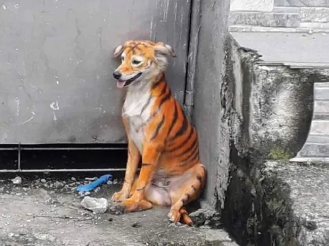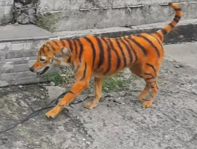 На шкурі пса фермер намалював характерні для тигра чорні смужки. Журналісти зазначили, що собаку розмалювали безпечною фарбою для волосся, яка може протриматись місяць.