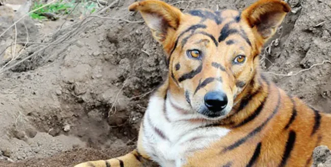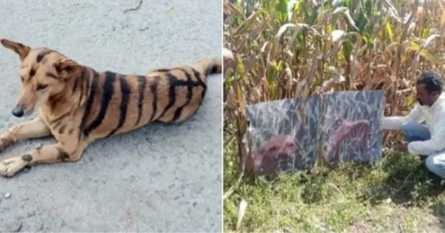 Фермер з індійського штату Карнатака Срікант Гоуда розфарбував свого пса у кольори тигра, щоб відлякувати мавп, які спустошували його угіддя.