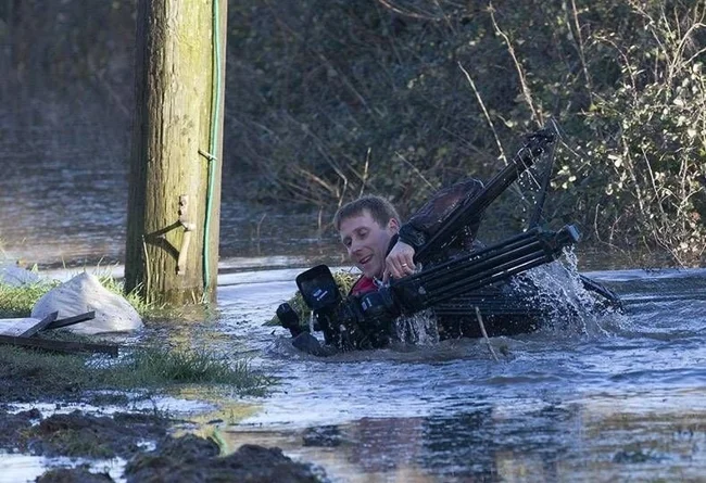 Велика Британія. Мурленд, Сомерсет. Оператор місцевого телебачення падає у воду разом із апаратурою.