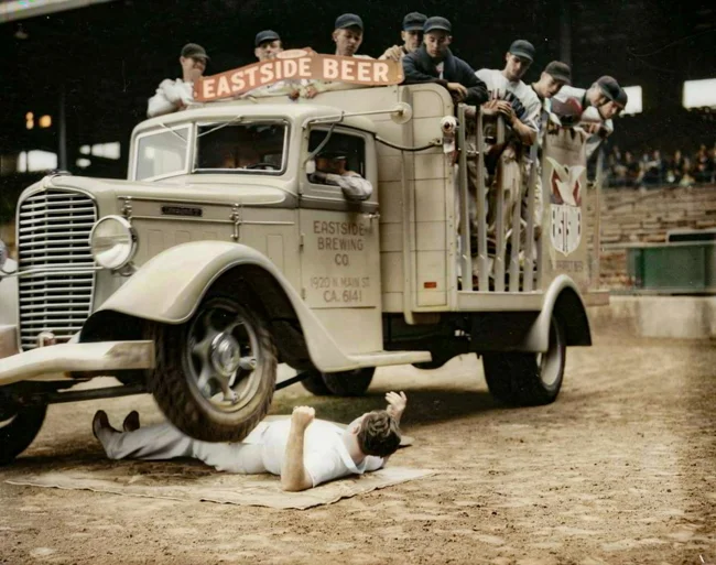 Вантажівка з людьми проїжджає силач Галену Гофу на стадіоні в Каліфорнії. США, 1935 рік.