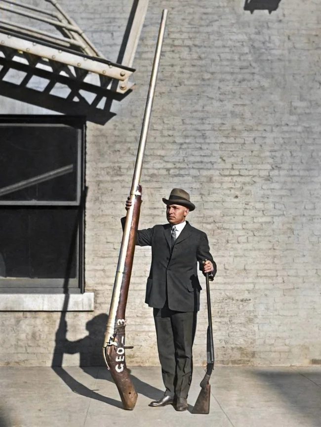 Головний інспектор полювання США Джордж А. з конфіскованою рушницею 10,9 дюйми та вагою 250 фунтів, яка використовувалася для полювання на качок. 1920 рік.