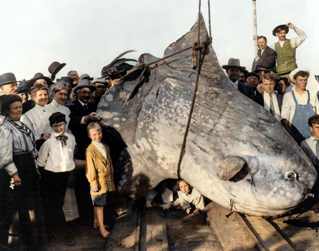 Риба-місяць, вагою 3500 фунтів (більше 1,5 тонн) спіймана рибалками острова Санта-Каталіна, штат Каліфорнія, квітень 1910 року.