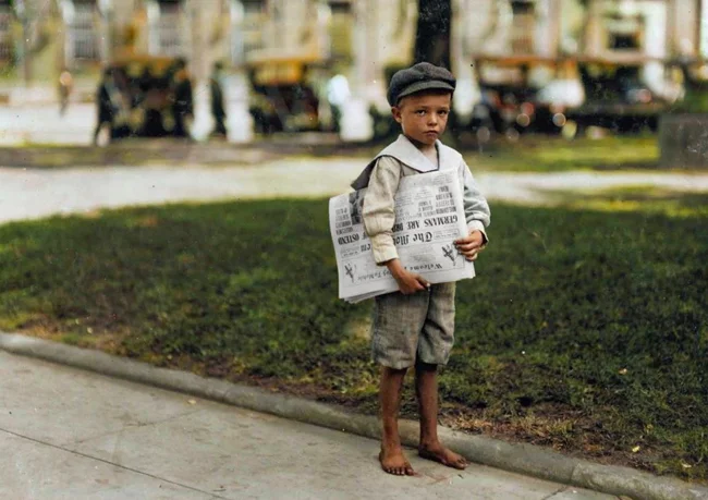 Одна із робіт знаменитого американського соціолога-фотографа Льюїса Хайна. З 1906 по 1914 він знімав на вулицях, як і в яких умовах працюють діти розносячи газети.