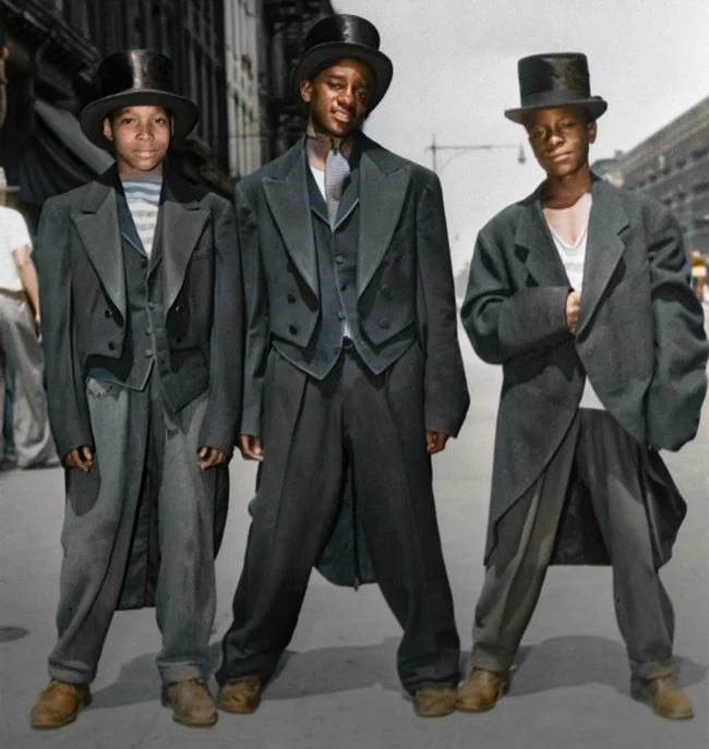 12-річний Вокер Робертс, 14-річний Генрі Кемпбелл і 13-річний Морріс Джексон демонструють свої нові "костюми від zoot" - смокінги, вкрадені з магазину офіційного одягу під час заворушень у Гарлемі у серпні 1943 року.