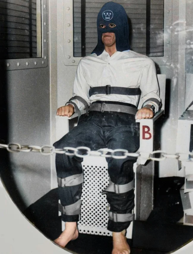 Засуджений до смерті у газовій камері. На лобі є рекламний логотип Westinghouse Electric Company. США, 1945 рік.