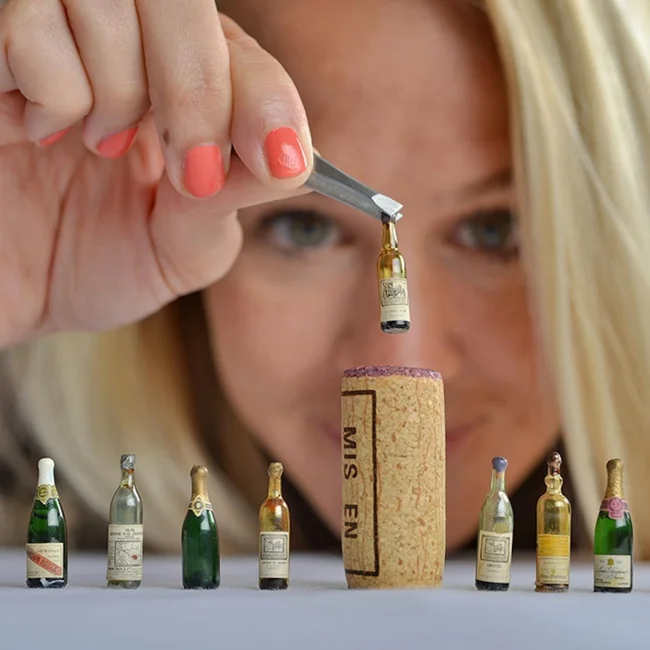 Пляшки з вином та шампанським 1920-х років були створені в масштабі 1/12, наповнені потрібним вмістом за допомогою крихітної піпетки, закупорені пробками та забезпечені відповідними етикетками для льоху лялькового будинку королеви Марії.