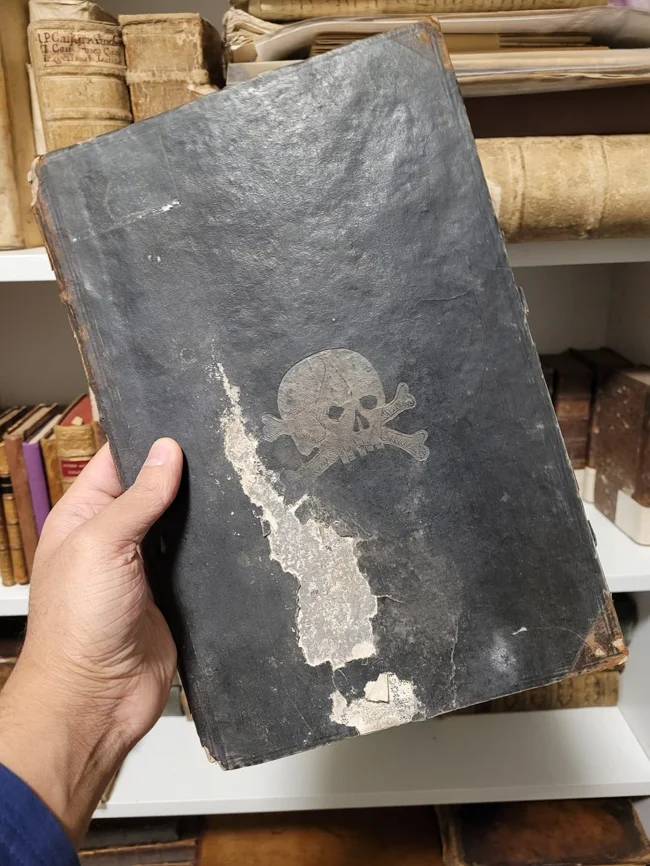 Missa in Agenda Defunctorum, 1733. Меса про мертвих початку XVIII століття, що містить піснеспіви для заупокійної меси, які священик мав використати біля вівтаря. Палітурка з черепом і схрещеними кістками.
