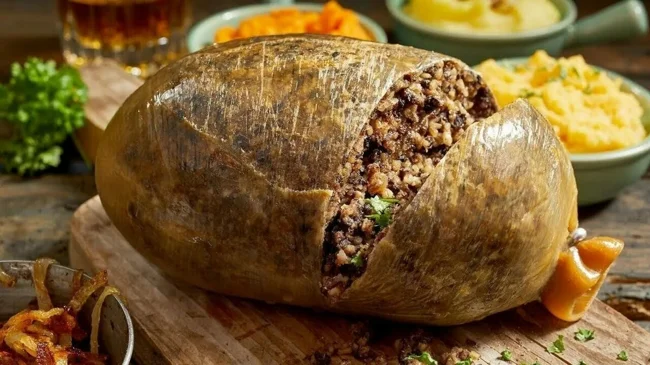 Ця страва, що подається в Шотландії, складається з овечого шлунка, фаршированого баранячою печінкою, легкими та серцем, цибулею, вівсянкою та різними спеціями.