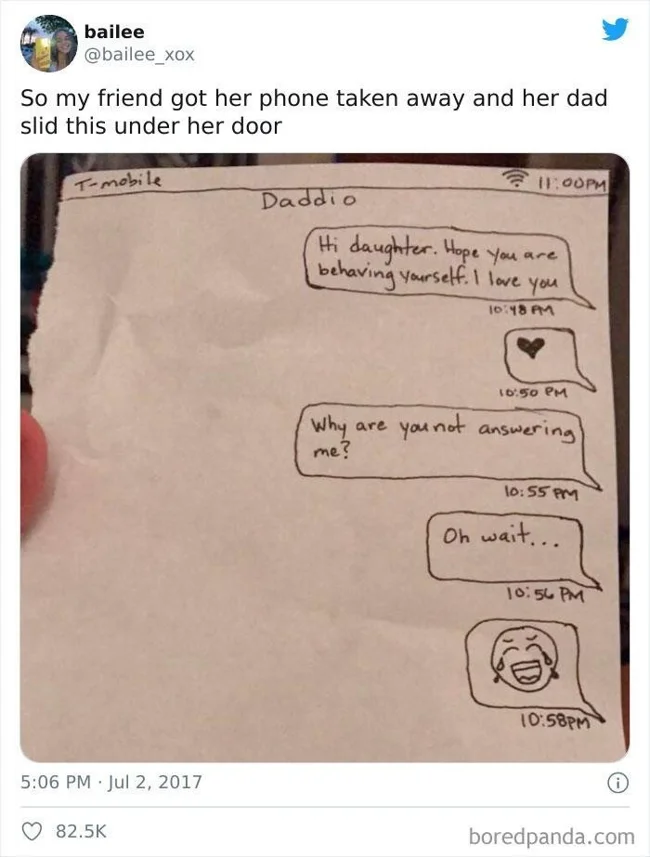6. "Батьки конфіскували у подруги телефон, і вранці батько підсунув їй під двері ось це"
