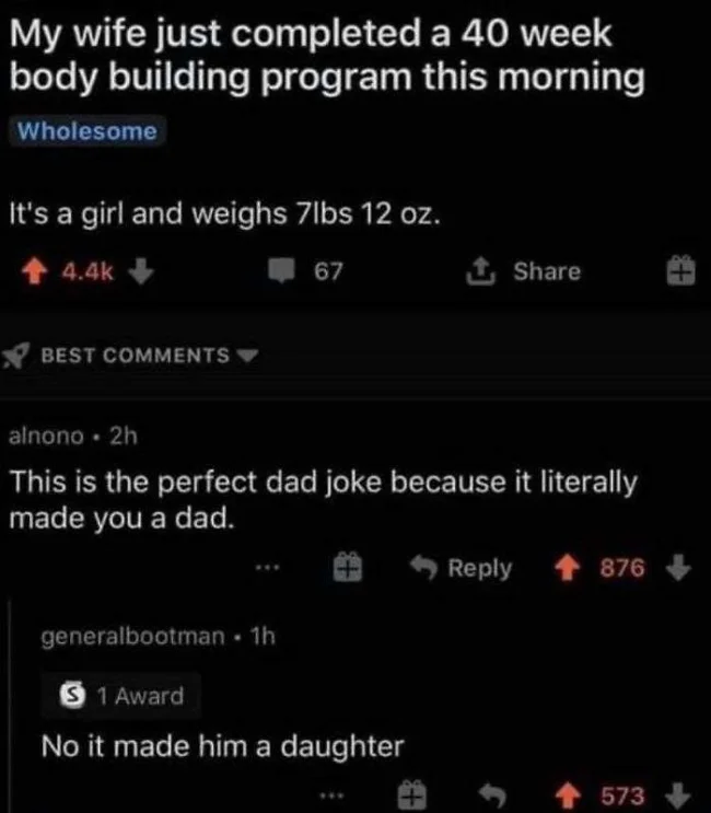 12. Моя дружина щойно завершила 40-тижневу програму з бодібілдингу (букв. тілобудування). Вийшла дівчинка вагою 3,5 кг.