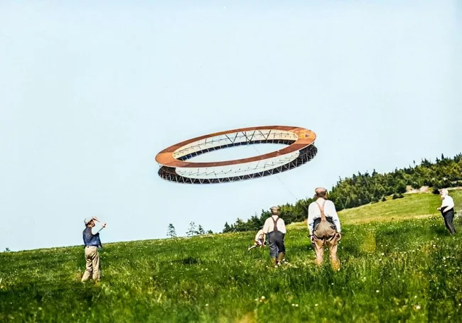 Американський і канадський учений, винахідник та підприємець шотландського походження Олександр Грейам Белл та його помічники тестують повітряного змія з панелями у формі тетраедра.