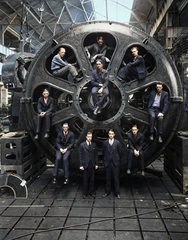 Інженери-студенти позують поруч із двигуном, у проектуванні якого вони брали участь, на заводі General Electric, 1928 рік.