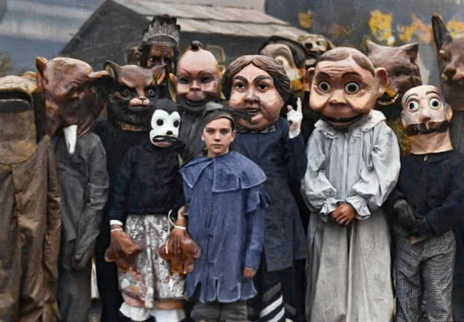 Традиція одягатися в костюми на Хелловін почалася ще з середини XIX століття, але тільки до 1930-х років популярність набули костюми, засновані на персонажах засобів масової інформації, таких як кіно, література та радіо. Ось і на цій фотографії ми бачимо щось схоже на маску Міккі Мауса.