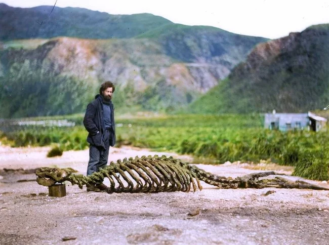 Вчений Австралазійської антарктичної експедиції Гарольд Гамільтон позує зі скелетом морського лева, 1913 рік.