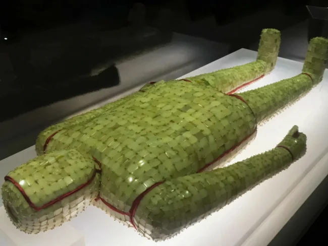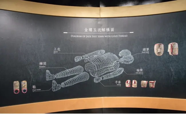Нефритовий костюм правителя складався з 2498 нефритових пластин і 1100 грамів золотої нитки, тоді як його дружина мала 2160 нефритових пластин і 700 грамів золотої нитки. І вони повністю повторювали контури тіл своїх господарів, включаючи маску, що повторює форми очей і носа.