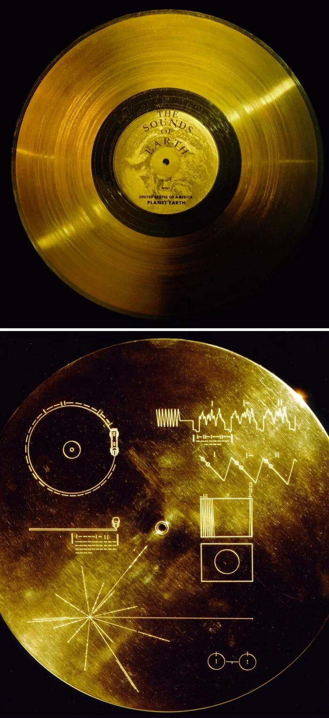 Позолочені інформаційні платівки з композиціями та звуками Землі. Прикріплені до космічних апаратів "Вояджер-1" та "Вояджер-2", які з 1977 року досліджують Сонячну систему. На футлярі зображені пояснення для позаземної цивілізації, також є фонографічна капсула та голка для відтворення запису.