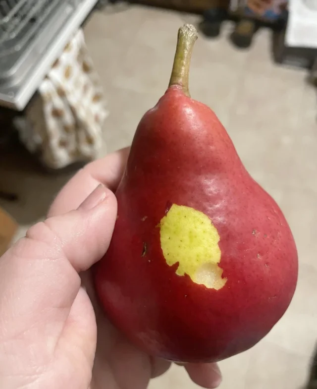 «Купила груш. Відколупала з однієї наклейку, а під нею виявилося це. Зелена шкірка, а не червона»