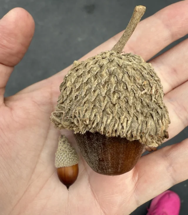 «Сьогодні під час прогулянки ми знайшли величезні жолуді (для порівняння – звичайний жолудь)»