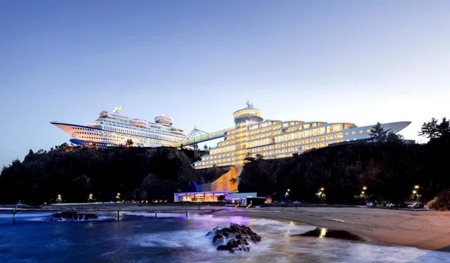 На вершині скелі біля міста Каннин у Південній Кореї розташований готель у вигляді круїзного лайнера.