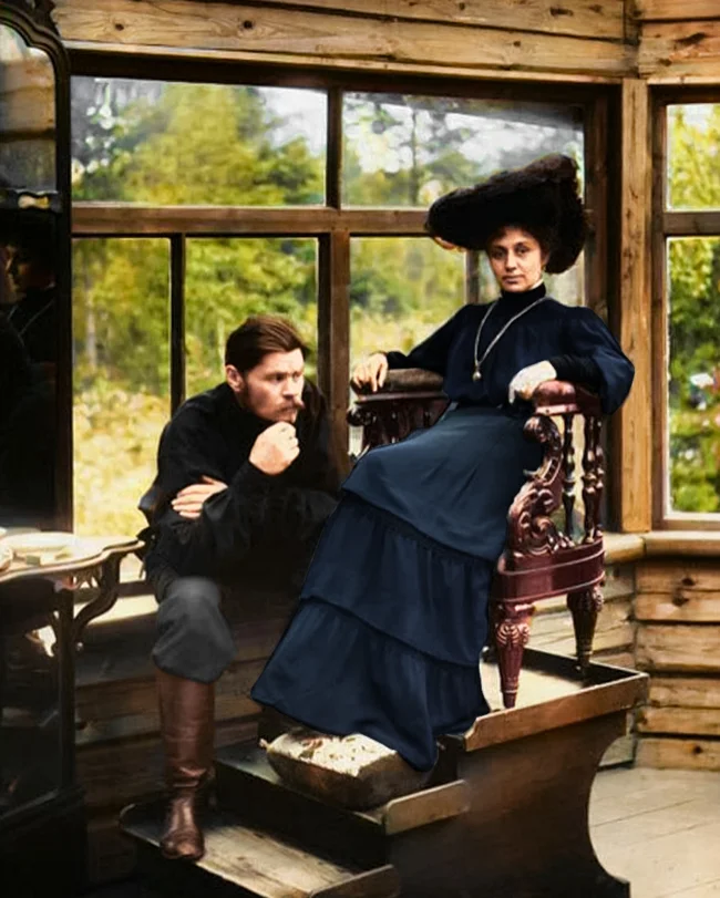 Максим Горький та Марія Андрєєва позують Іллі Рєпіну в садибі «Пенати», 1905 рік.